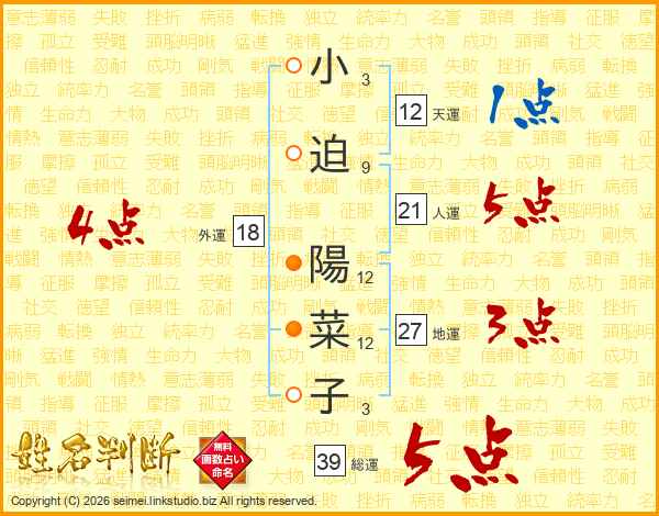 小(3画)迫(9画) 陽(12画)菜(12画)子(3画)