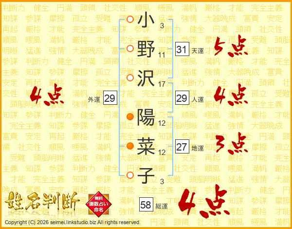 小(3画)野(11画)沢(17画) 陽(12画)菜(12画)子(3画)