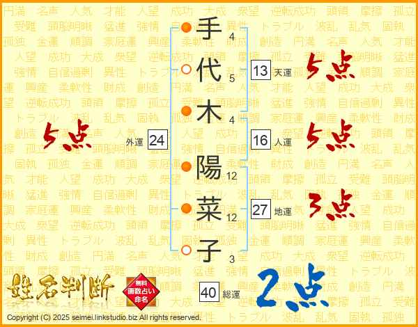 手代木陽菜子さんの天運は13画の5点!