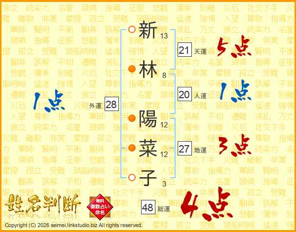 新(13画)林(8画) 陽(12画)菜(12画)子(3画)