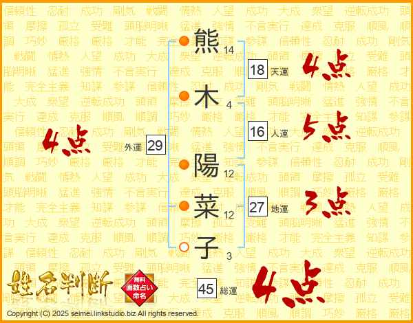熊木陽菜子さんの総運は45画の4点!