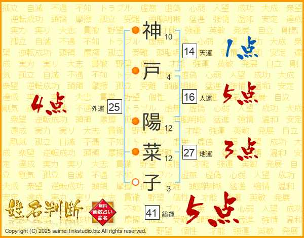 神(10画)戸(4画) 陽(12画)菜(12画)子(3画)