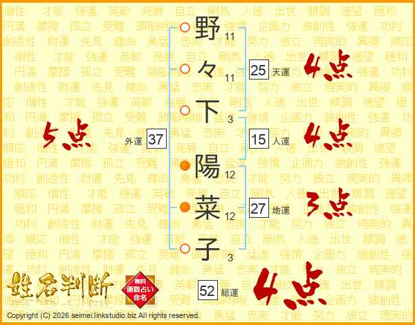 野々下陽菜子さんの総運は52画の4点!