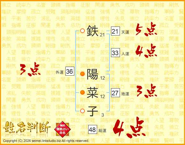 鉄陽菜子さんの総運は48画の4点!