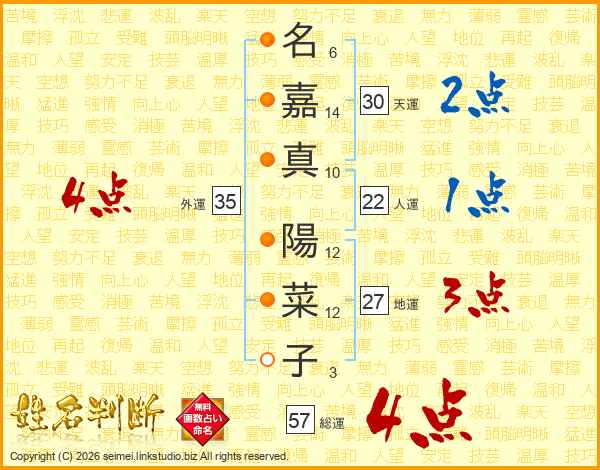 名(6画)嘉(14画)真(10画) 陽(12画)菜(12画)子(3画)