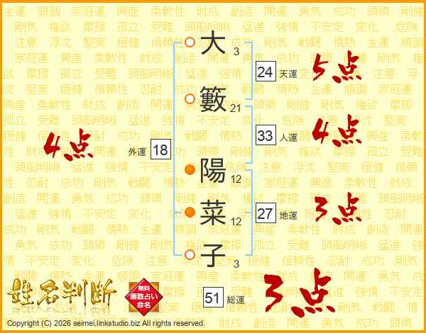 大籔陽菜子さんの総運は51画の3点!