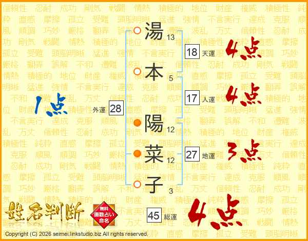 湯(13画)本(5画) 陽(12画)菜(12画)子(3画)