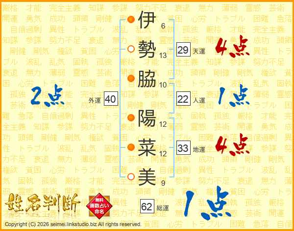 伊勢脇陽菜美さんの総運は62画の1点!
