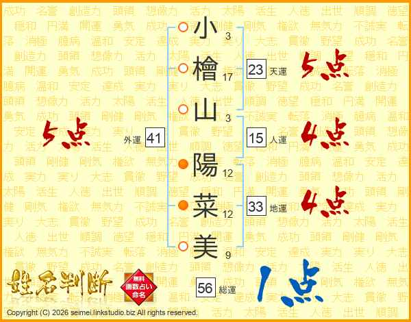 小(3画)檜(17画)山(3画) 陽(12画)菜(12画)美(9画)