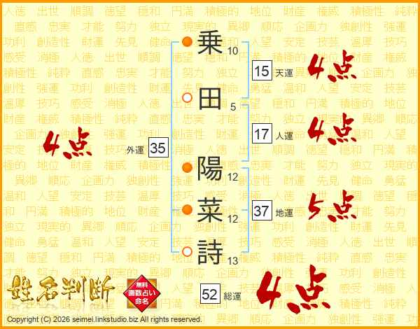 乗(10画)田(5画) 陽(12画)菜(12画)詩(13画)