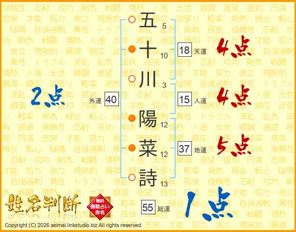 生活面を象徴する運勢です。外部から受ける影響力を表し、結婚運、家庭運や職場、環境への順応性を表します。総運から人運を引いた画数。姓や名が1文字の場合を除く。