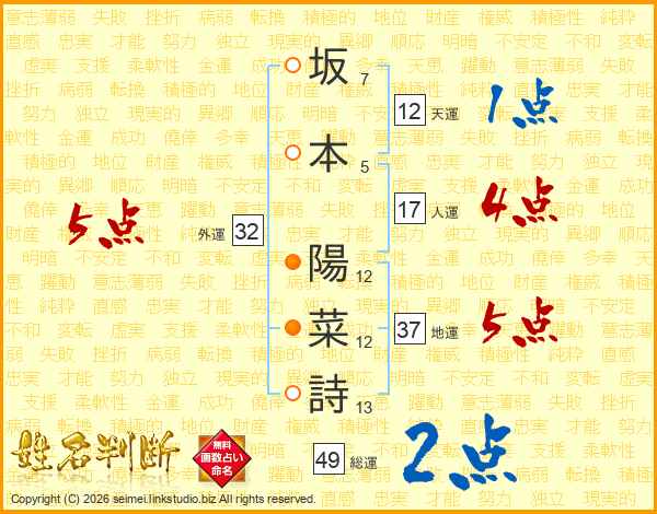 坂(7画)本(5画) 陽(12画)菜(12画)詩(13画)