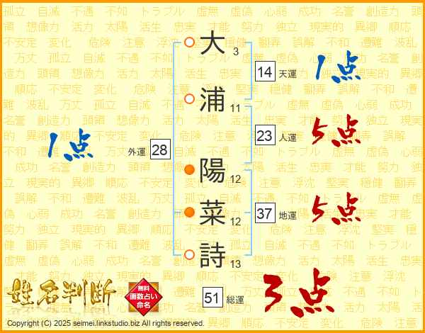 大(3画)浦(11画) 陽(12画)菜(12画)詩(13画)