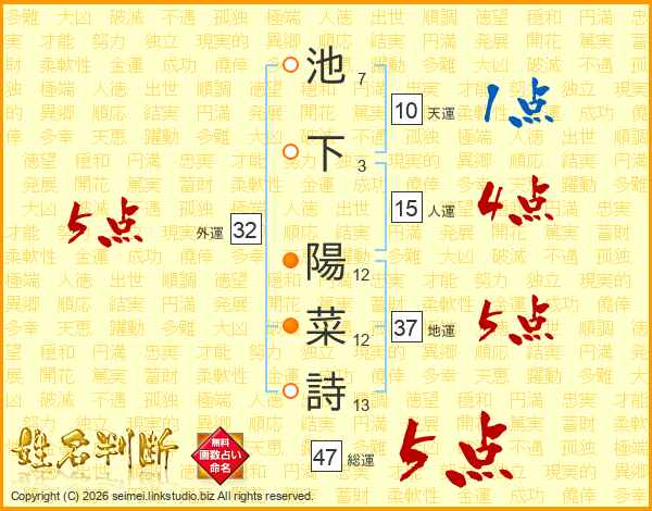 池(7画)下(3画) 陽(12画)菜(12画)詩(13画)