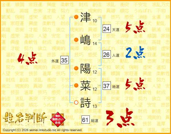 津(10画)嶋(14画) 陽(12画)菜(12画)詩(13画)