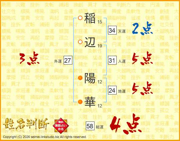 稲(15画)辺(19画) 陽(12画)華(12画)