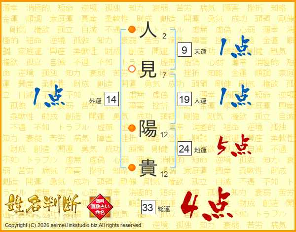 生活面を象徴する運勢です。外部から受ける影響力を表し、結婚運、家庭運や職場、環境への順応性を表します。総運から人運を引いた画数。姓や名が1文字の場合を除く。