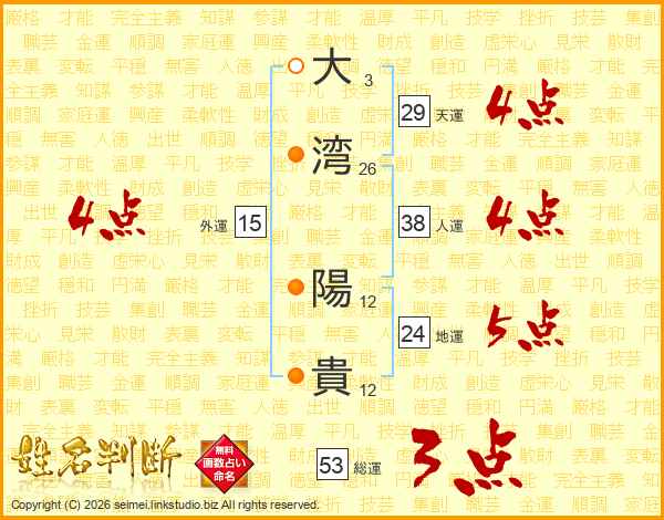 大(3画)湾(26画) 陽(12画)貴(12画)