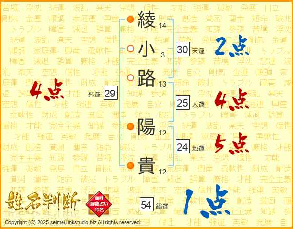 綾(14画)小(3画)路(13画) 陽(12画)貴(12画)