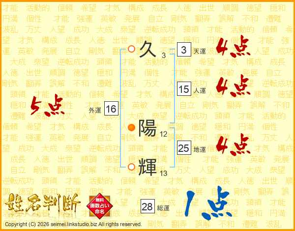生活面を象徴する運勢です。外部から受ける影響力を表し、結婚運、家庭運や職場、環境への順応性を表します。総運から人運を引いた画数。姓や名が1文字の場合を除く。