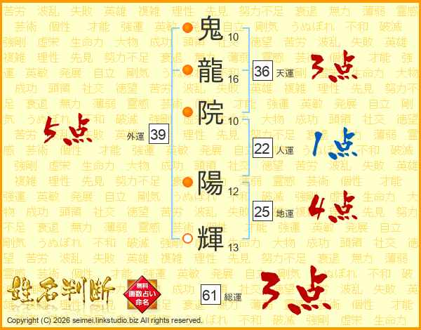 鬼(10画)龍(16画)院(10画) 陽(12画)輝(13画)