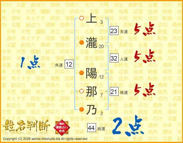 上(3画)瀧(20画) 陽(12画)那(7画)乃(2画)