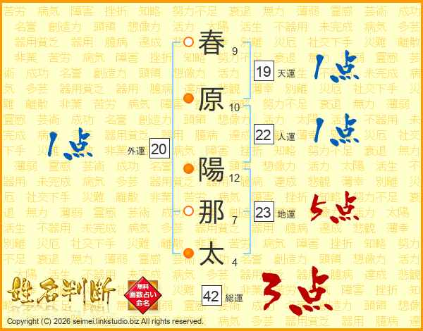 春(9画)原(10画) 陽(12画)那(7画)太(4画)