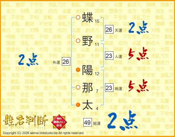 蝶野陽那太さんの総運は49画の2点!