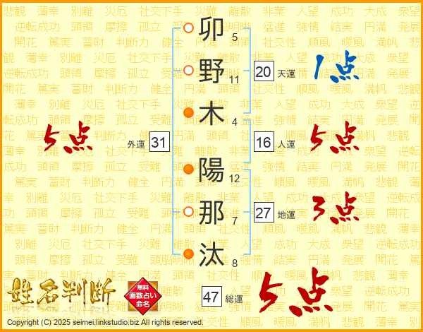 卯(5画)野(11画)木(4画) 陽(12画)那(7画)汰(8画)