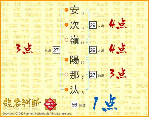 安(6画)次(6画)嶺(17画) 陽(12画)那(7画)汰(8画)