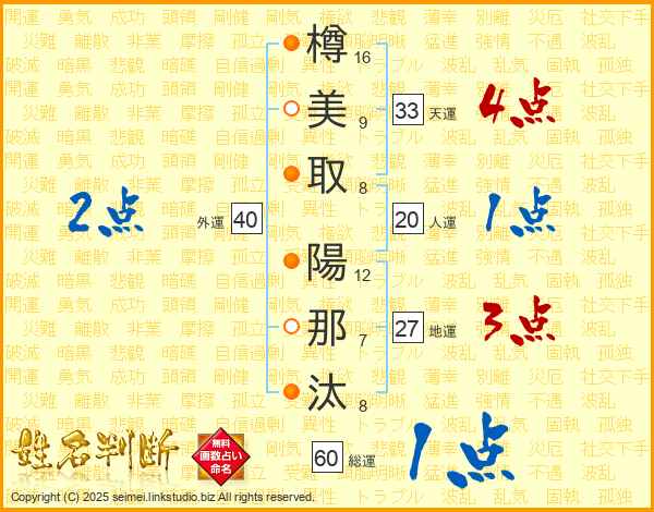 樽(16画)美(9画)取(8画) 陽(12画)那(7画)汰(8画)