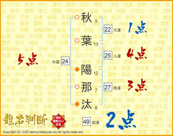 秋(9画)葉(13画) 陽(12画)那(7画)汰(8画)