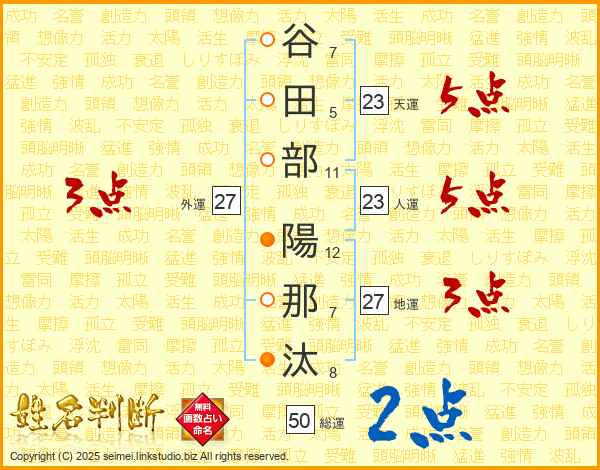 谷(7画)田(5画)部(11画) 陽(12画)那(7画)汰(8画)