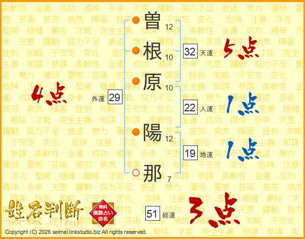 曽(12画)根(10画)原(10画) 陽(12画)那(7画)