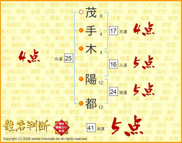 茂(9画)手(4画)木(4画) 陽(12画)都(12画)