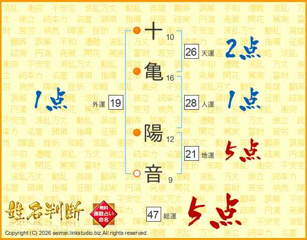 画数の奇数(○陽)と偶数(●陰)の配列で吉凶を占います。どちらかにかたよる名前は大凶名で避ける必要があります。画数の奇数偶数。