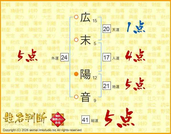 生活面を象徴する運勢です。外部から受ける影響力を表し、結婚運、家庭運や職場、環境への順応性を表します。総運から人運を引いた画数。姓や名が1文字の場合を除く。
