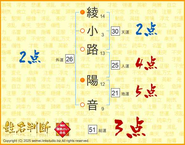 綾(14画)小(3画)路(13画) 陽(12画)音(9画)