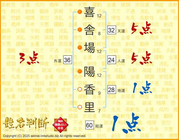 喜(12画)舎(8画)場(12画) 陽(12画)香(9画)里(7画)