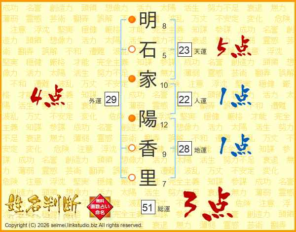 明(8画)石(5画)家(10画) 陽(12画)香(9画)里(7画)
