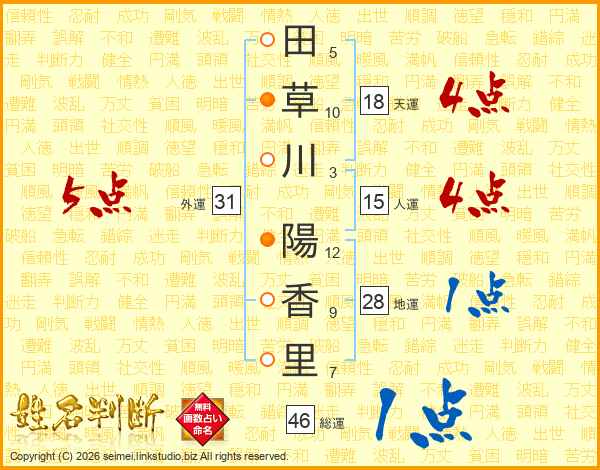 田(5画)草(10画)川(3画) 陽(12画)香(9画)里(7画)