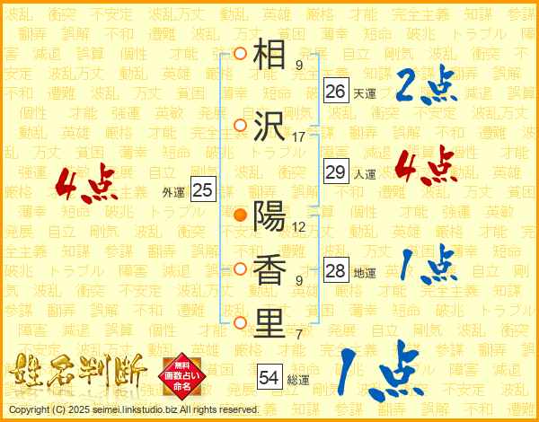 相(9画)沢(17画) 陽(12画)香(9画)里(7画)
