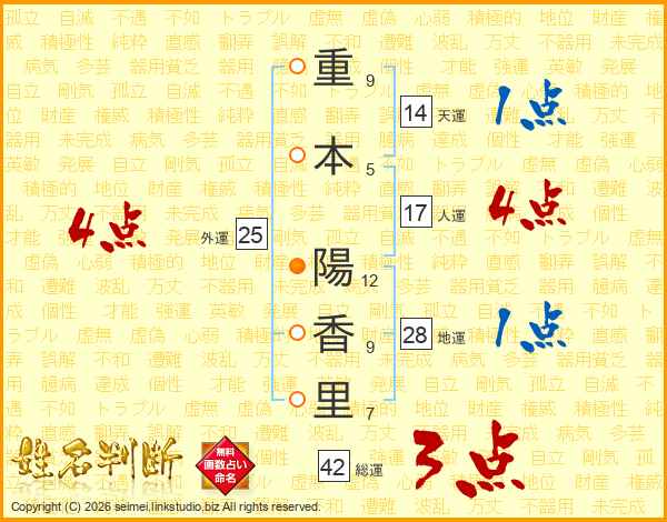 重(9画)本(5画) 陽(12画)香(9画)里(7画)