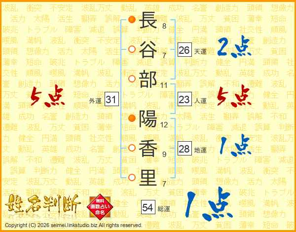 長(8画)谷(7画)部(11画) 陽(12画)香(9画)里(7画)