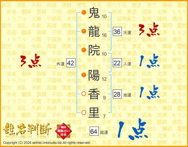 鬼(10画)龍(16画)院(10画) 陽(12画)香(9画)里(7画)