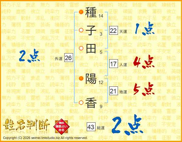 種(14画)子(3画)田(5画) 陽(12画)香(9画)