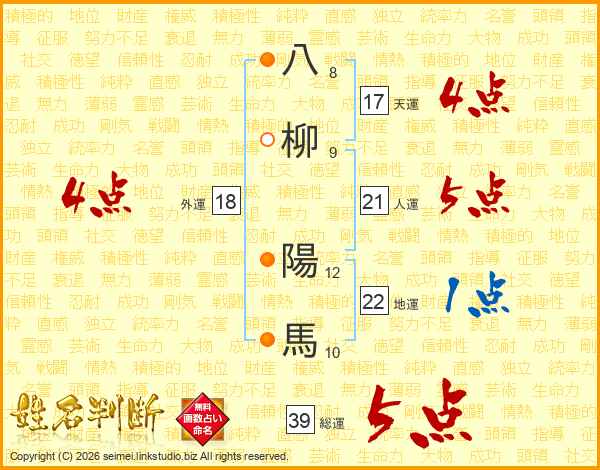 八柳陽馬さんの総運は39画の5点!