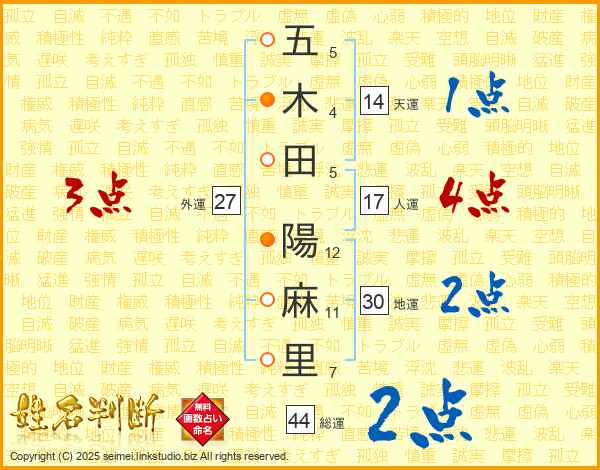 五(5画)木(4画)田(5画) 陽(12画)麻(11画)里(7画)