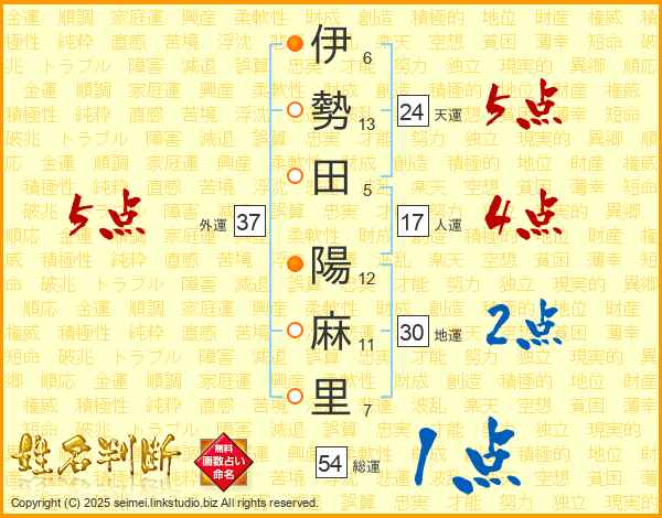 伊(6画)勢(13画)田(5画) 陽(12画)麻(11画)里(7画)