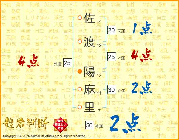 佐(7画)渡(13画) 陽(12画)麻(11画)里(7画)